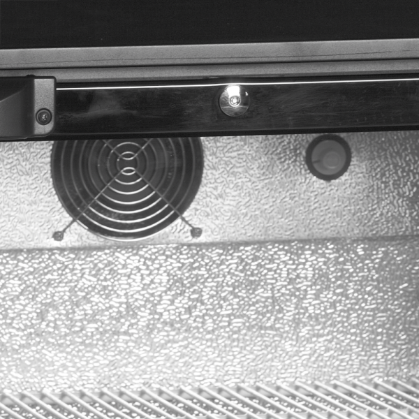 Minibar má křídlové dveře s dvojitým proskleným tvrzeným sklem, které zajišťuje pěknou prezentaci výrobků. Nastavitelné drátěné police mají bílý plastový povrch pro snadnou údržbu. Minibar je ideální pro rušné barové prostředí a díky černému exteriéru a hliníkovému interiéru ve štukovém provedení působí moderně. Skvělá volba pro každý bar.