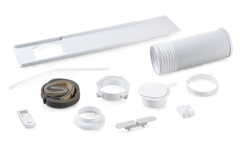 Sada pro uchycení hadice pro odvod teplého vzduchu do okna (pro vertikálně, nebo horizontálně posuvná okna): okenní výsuvná lišta o délce 67,5-120 cm (šířka 16,5 cm), příruba na hadici pro snadné uchycení do lišty, pěnové těsnění
