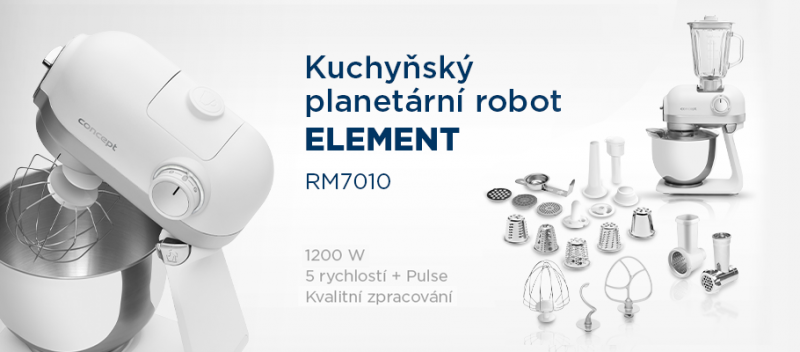 Kuchyňský planetární robot ELEMENT v elegantním bílém provedení se stane nejen funkčním, ale i designovým doplňkem vaší kuchyně. Pomůže vám s přípravou těst, krémů, dokonale ušlehá šlehačku i bílky. Navíc je vybaven mixérem, struhadlem a mlýnkem na maso s nástavci na plnění párků, klobás a tvořítkem na cukroví. V jednom těle získáte hned několik užitečných pomocníků.