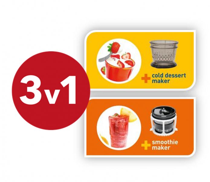 3 spotřebiče v 1: součástí příslušenství je i sítko na smoothie a sítko na studené dezerty. Připravte si ke snídani zelené smoothie nebo potěšte děti výbornými ovocnými dezerty s jogurtem nebo tvarohem.