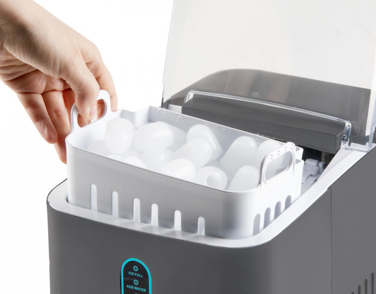 Cyklus na výrobu 8 kostek trvá jen 6-8 minut a můžete si zvolit, zda chcete menší nebo větší kostky. Provedení v moderní matně šedé barvě je působivé a neokoukané.