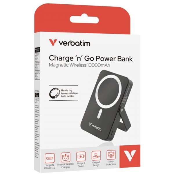 Verbatim Charge 'n' Go je magnetická bezdrátová powerbanka s kapacitou 10 000 mAh, která umožňuje rychlé a pohodlné nabíjení na cestách.