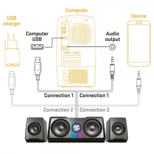 Největší výhodou USB reproduktorů 2.1 YENKEE YSP 215BK je však jednoduché ovládání. Kvalitní zvuk zprostředkuje přes klasický 3,5mm audio konektor, který stačí zasunout do zdířky na PC. A stejné je to s ovládáním hlasitosti, která se ovládá prostřednictvím stříbrného ovladače na přední straně basového reproduktoru. Napájení pak zajistí USB kabel, kterým propojíte reproduktory s PC nebo notebookem.Hraje všemi barvami